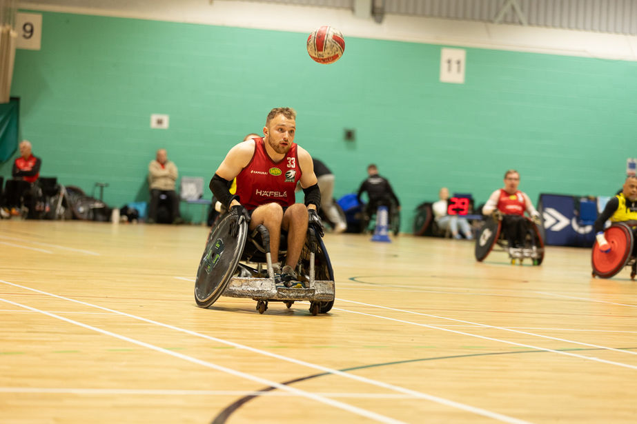 This is the Leicester Tigers Swifts wheelchair rugby team playing in a tournament at the Stoke Mandeville stadium on October 2024